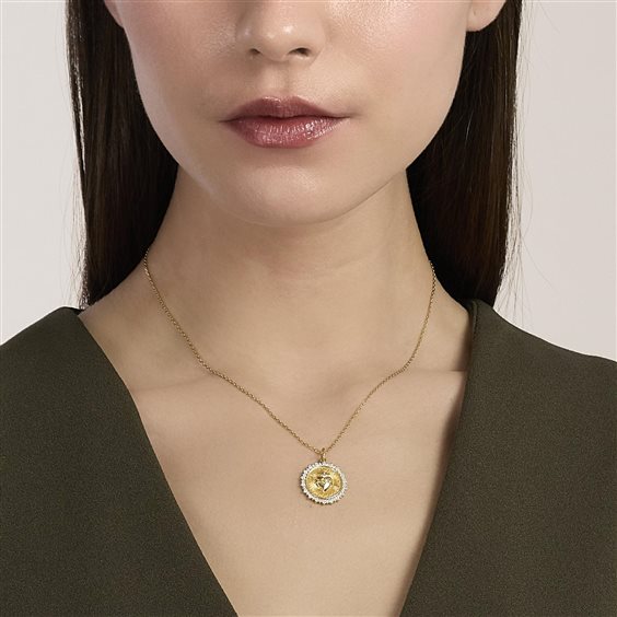 Girocollo regolabile in argento rodiato placcato oro 18K con catena forzatina diamantata e ciondolo saco cuore con bordo in zirconi bianchi • Diametro ciondolo: 18,2 mm • Diametro zirconi: 1,2 e 1,5 mm • Diamensione catena: 1,2 mm • Misura regolabile, lunghezza da 40 a 45 cm • Materiale: Argento 925, Zirconi • Finitura: Placcatura oro 18k