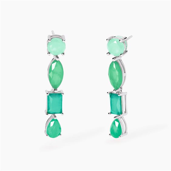 Orecchini in argento 925/ººº rodiato con elementi in fusion stone di glass verde e cristallo di rocca taglio baguette e goccia 7x5 mm, navette 10x5 mm e Ø 6 mm, lunghezza totale orecchino 3.4 cm