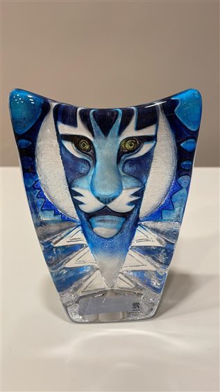 SCULTURA VOLTO DI LEONE BLU CON SFUMATURE AZZURRE IN CRISTALLO SVEDESE MALERAS. MATS JONASSON MALERAS è la patria dell'artigianato tradizionale svedese del cristallo e di una forte tradizione artistica svedese e rappresenta una nuova generazione di designer e artigiani. Mats Tomasson è un maestro del dettaglio e, da oltre 30 anni, ha impresso il suo marchio sulla vetreria di Mäleras, dove l'azienda è sinonimo di creatività brillante. Un oggetto in vetro di Mäleräs Glassworks dà la garanzia di avere una creazione in cristallo completamente svedese.
