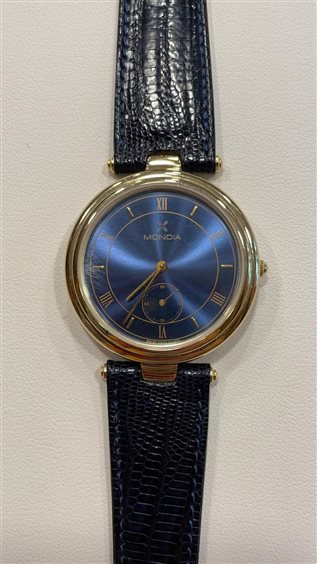 OROLOGIO MONDIA UNISEX CASSA IN ACCIAIO PLACCATO ORO GIALLO FONDO BLU SOLO TEMPO CON PICCOLI SECONDI POSIZIONATI AL NUMERO 6.CINTURINO PELLE BLU CHIUSURA ARDIGLIONE IN ACCIIAO PLACCATO ORO GIALLO.