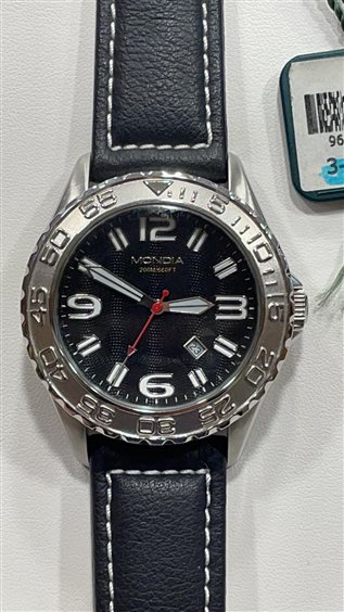 OROLOGIO MONDIA UOMO CASSA IN ACCIAIO CON GHIERA GIREVOLE IN ACCIAIO FONDO NERO SOLO TEMPO CON DATARIO POSIZIONATO TRA IL NUMERO 4 E 5.CINTURINO PELLE NERO CON CHIUSURA ARDIGLIONE IN ACCIAIO.