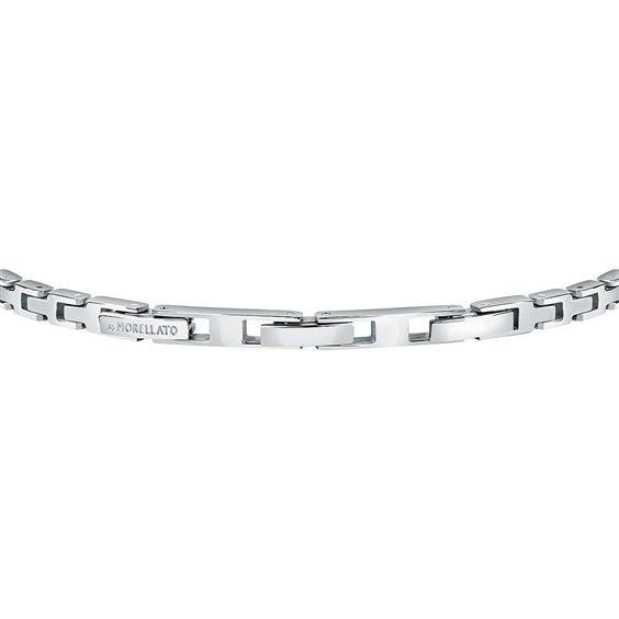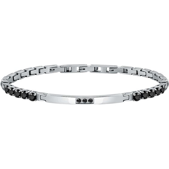 Bracciale in acciaio con 10 zirconi laterali neri da 5 mm l'uno e tre centrali più piccoli. Accorciabile a piacere.