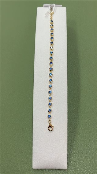 BRACCIALE NANAN TENNIS IN ARGENTO 925 PLACCATO ORO GIALLO CON ZIRCONI AZZURRI, MISURA 13 CM.