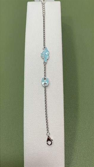BRACCIALE NANAN IN ARGENTO 925 CON DINOSAURO SMALTATO AZZURRO, MISURA 15 CM, CHIUSURA A MOSCHETTONE.