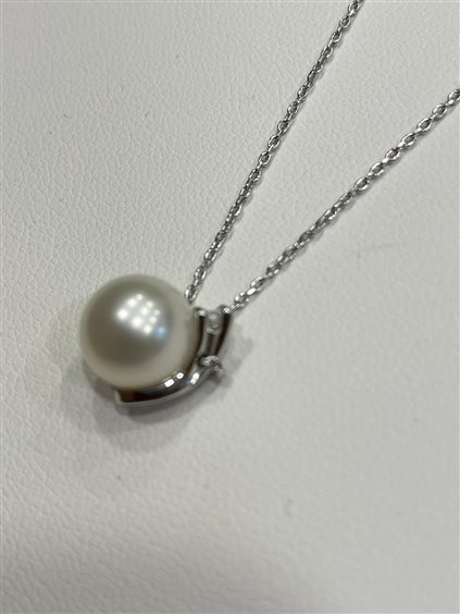 COLLANA NIMEI DONNA IN ORO BIANCO KT 18 CON PENDENTE PERLA ACQUA SALATA MM 8.5/9 CON BRILLANTE KT 0.04 H. MISURA 45 CM.