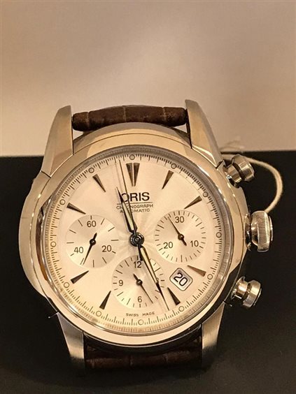Orologio Oris uomo in acciaio "Atelier" cronografo cassa acciaio mm44,5 fondo argento con cinturino in pelle marrone, lancette e indici luminescenti ,vetro zaffiro e fondo zaffiro antiriflesso ,data al numero 4. Resistenza all'acqua 3 atm.