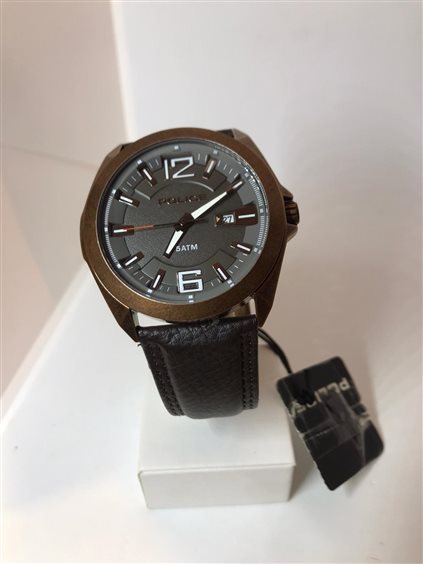 Orologio Police uomo con cassa in acciaio bronzo e cinturino in ecopelle marrone con chiusura ardiglione in acciaio bronzo,fondo marrone solo tempo con datario sul numero 3.