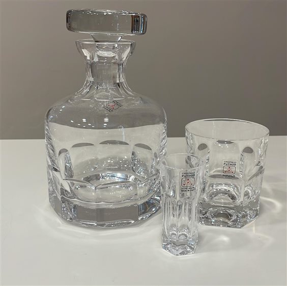 SERVIZIO PUTHOD IN CRISTALLO TRASPARENTE COMPOSTO DA: 1 BOTTIGLIA COGNAC, 6 BICCHIERI ACQUA E 6 BICCHIERI LIQUORE BOTTIGLIA: h21cm BICCHIERI ACQUA: h10cm BICCHIERI LIQUORE: h8cm