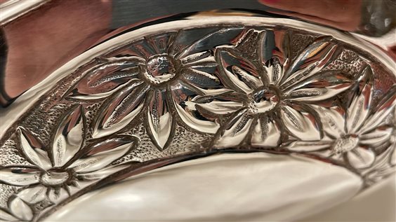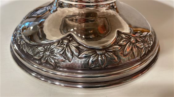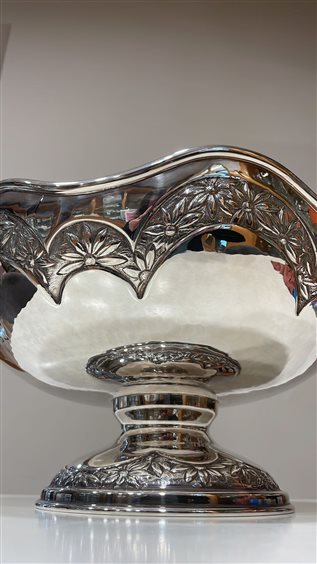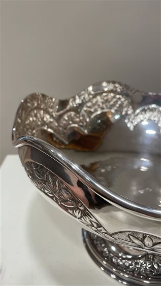 PREGIATO PEZZO D'ARGENTERIA DELL'ARTIGIANATO FIORENTINO. L'ALTA QUALITA' DEI MATERIALI E DELLA LAVORAZIONE SONO GARANTITI DAI MARCHI LEGALI IMPRESSI SUL PEZZO. ALZATA RADDI IN ARGENTO MASSICCIO 800, GR 1170, REALIZZATA A MANO CON MOTIVI FLOREALI. BORDO A ONDE, SUPERFICIE MARTELLATA E LUCIDA.
