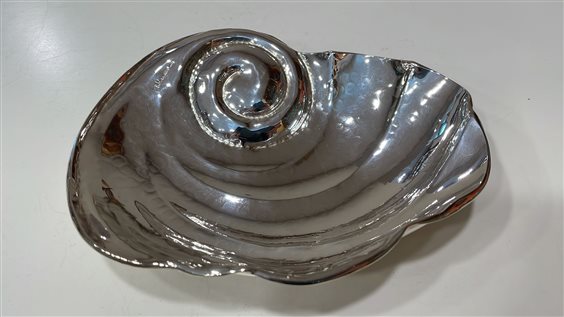 PREGIATO PEZZO D'ARGENTERIA. L'ALTA QUALITA' DEI MATERIALI E DELLA LAVORAZIONE SONO GARANTITI DAI MARCHI LEGALI IMPRESSI SUL PEZZO. CIOTOLA A FORMA DI CONCHIGLIA RENATO RADDI IN ARGENTO 925, GR 191. CIOTOLA FATTA A MANO CON SUPERFICIE MARTELLATA.