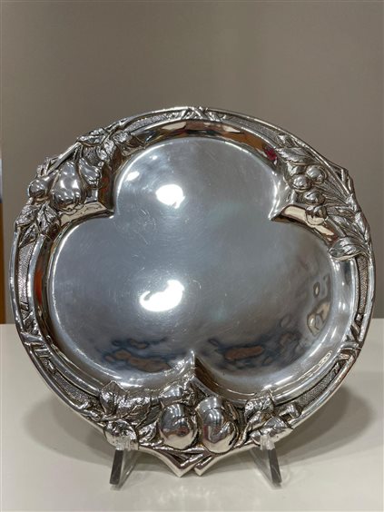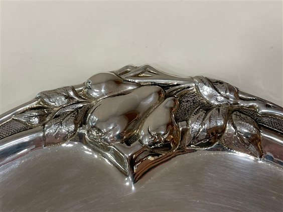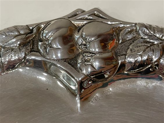 PREGIATO PEZZO D'ARGENTERIA DELL'ARTIGIANATO FIORENTINO. L'ALTA QUALITA' DEI MATERIALI E DELLA LAVORAZIONE SONO GARANTITI DAI MARCHI LEGALI IMPRESSI SUL PEZZO. VASSOIO RENATO RADDI IN ARGENTO MASSICCIO 800, GR 215, BORDI DECORATI A MANO CON MELOGRANI, PERE E CILIEGIE.