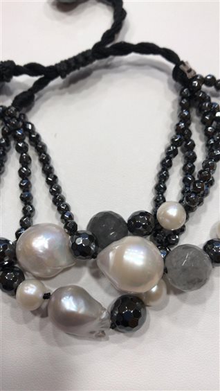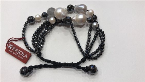 BRACCIALE RAJOLA BLOOM 5 FILI DI EMATITE GRIGIA CON PERLE BIANCHE BIWA E QUARZO GRIGIO CON MARCHIO IN ORO BIANCO KT 18 CHIUSURA IN CORDA REGOLABILE.