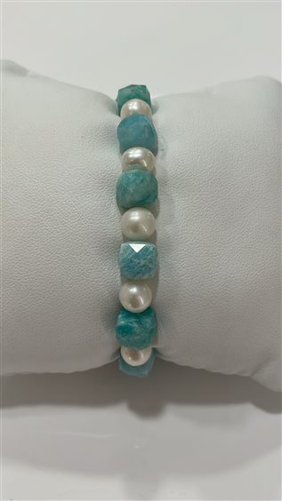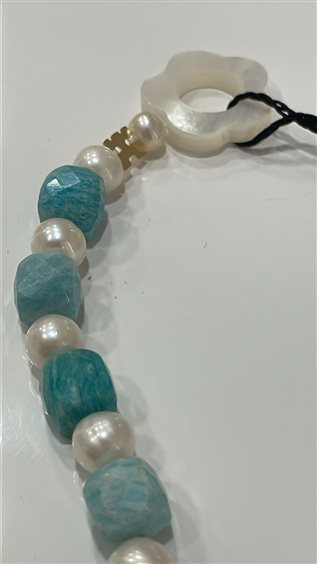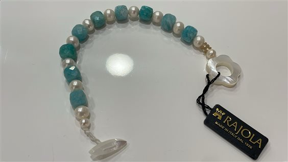 BRACCIALE RUBIK RAJOLA IN PERLE BIANCHE E AMZZONITE AZZURRA CON MARCHIO IN ORO GIALLO KT 18 E CHIUSURA IN MADREPERLA BIANCA.