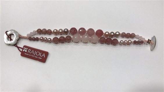 Bracciale Rajola in oro, perle, quarzo rosa, lepidolite, quarzo strawberry, Rajola. Collezione LINK con gancio in madreperla rosa.