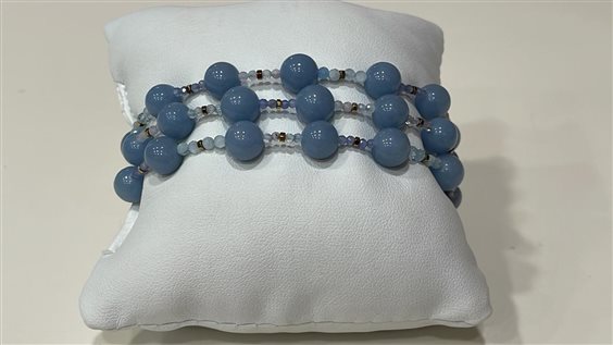 BRACCIALE RAJOLA CECILIA CON TANZANITE FLUORESCENTE, AMETISTA, ACQUAMARINA, EMATITE. GANCIO IN MADREPERLA BIANCA E MARCHIO IN ORO BIANCO KT18