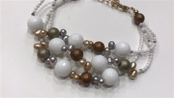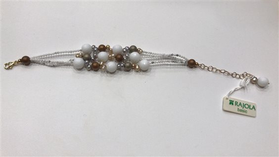 BRACCIALE RAJOLA GLACIOLO 3 FILI DI AULITE EMATITE SATINATA CON PERLE GRIGIE DORATE E BRONZO CON CHIUSURA MOSCHETTONE IN ARGENTO DORATO. MISURA BRACCIALE CM 19 CON POSSIBILITA' DI ESTENDERE FINO A CM 23.