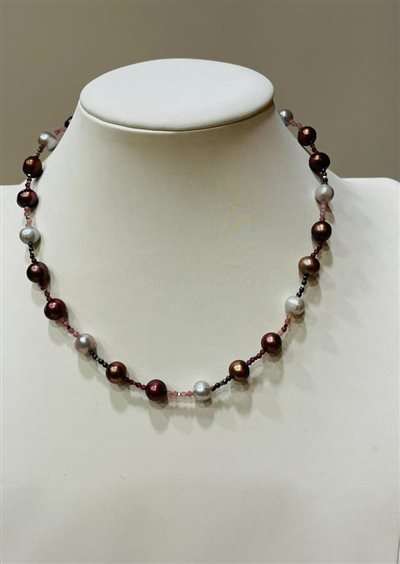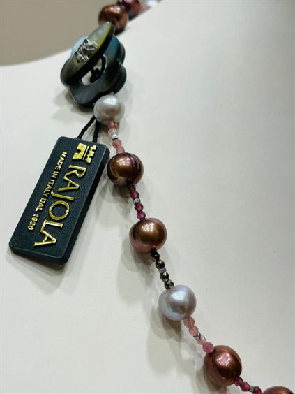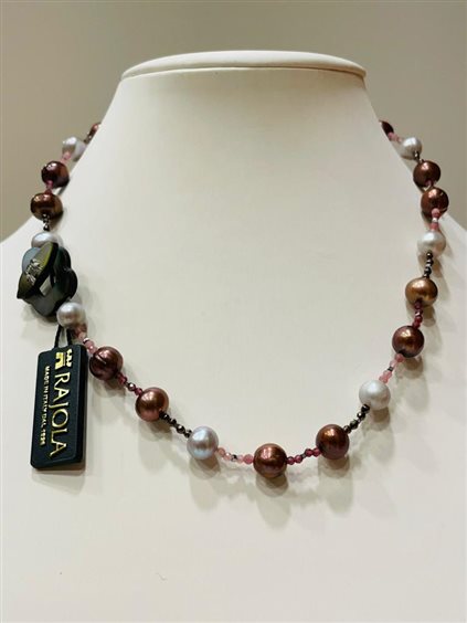 COLLANA CECILIA RAJOLA CON PERLE GRIGIE/VIOLA/MARRONE, TORMALINA E GRANATO CON GANCIO MADREPERLA GRIGIA CON MARCHIO IN ORO BIANCO KT 18.