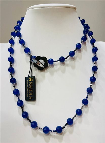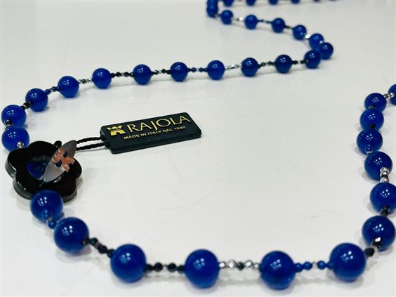 COLLANA CECILIA RAJOLA LUNGA IN GIADA BLU E LAPIS CON GOLDSTONE BLU, SPINELLO BLU ED EMATITE,GANCIO IN MADREPERLA GRIGIA CON MARCHIO IN ORO BIANCO KT 18.