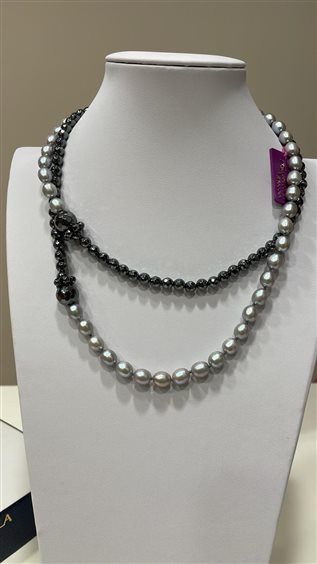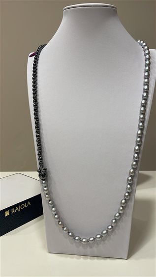 COLLANA RAJOLA PRIMULA CON EMATITE GRIGIA E PERLE GRIGIE CON MARCHIO RAJOLA IN ARGENTO.