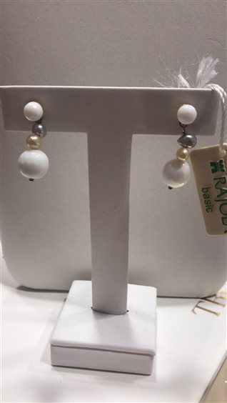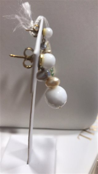 ORECCHINI RAJOLA GLADIOLO IN ARGENTO DORATO CON PASTA BIANCA E PERLE DORATE E GRIGIE.