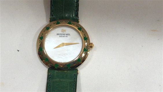 OROLOGIO RAYMOND WEIL DONNA CASSA IN ACCIAIO DORATO CON SMALTO VERDE QUADRANTE FONDO MADREPERLA SOLO TEMPO CINTURINO PELLE CHIUSURA ARDIGLIONE.