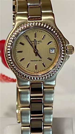 OROLOGIO RAYMOND WEIL COLLEZIONE AMADEUS 200 DONNA, CASSA E CINTURINO IN ACCIAIO PLACCATO ORO GIALLO KT 18 A 10 MICRON. FONDO PLACCATO ORO GIALLO SOLO TEMPO CON DATARIO POSIZIONATO AL NUMERO 3. CHIUSURA DEPLOYANTE. RESISTENZA ALL'ACQUA 5 ATM.