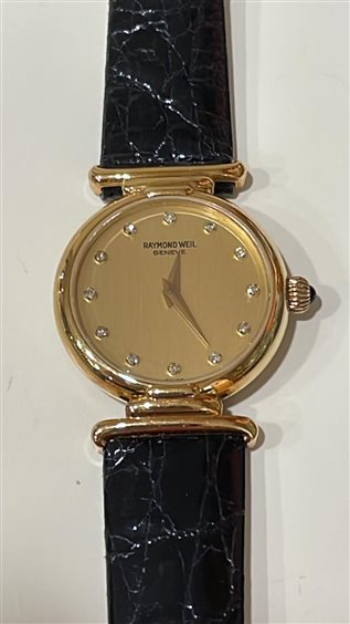 OROLOGIO RAYMOND WEIL DONNA CASSA IN ORO GIALLO KT 18 FONDO ORO GIALLO KT 18 SOLO TEMPO. QUADRANTE CON NUMERI ROMANI E CON DIAMANTI TAGLIO BRILLANTE. CINTURINO IN PELLE DI COCCODRILLO NERO, CHIUSURA ARDIGLIONE IN ACCIAIO PLACCATO ORO GIALLO.