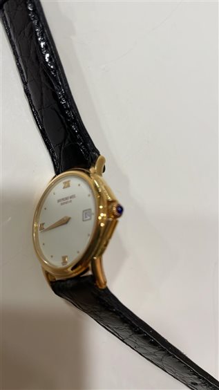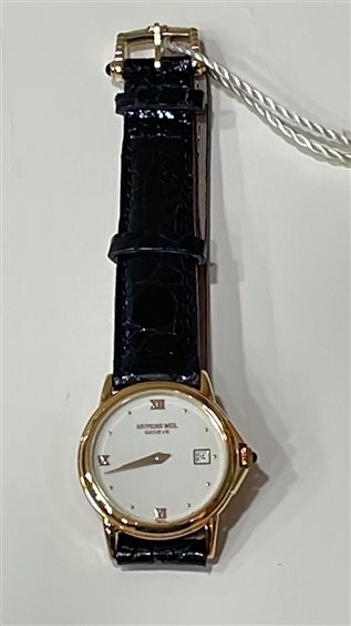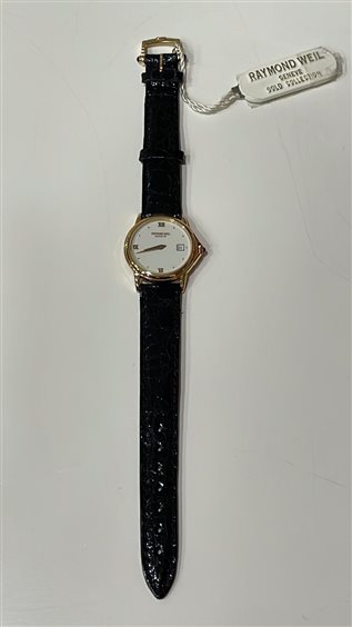 OROLOGIO RAYMOND WEIL DONNA CASSA IN ORO GIALLO KT 18 FONDO BIANCO SOLO TEMPO CON NUMERI ROMANI PRESENTI SUL QUADRANTE E DATARIO POSIZIONATO AL NUMERO 3. CINTURINO PELLE COCCODRILLO NERO CHIUSURA ARDIGLIONE IN ACCIAIO PLACCATO ORO GIALLO.