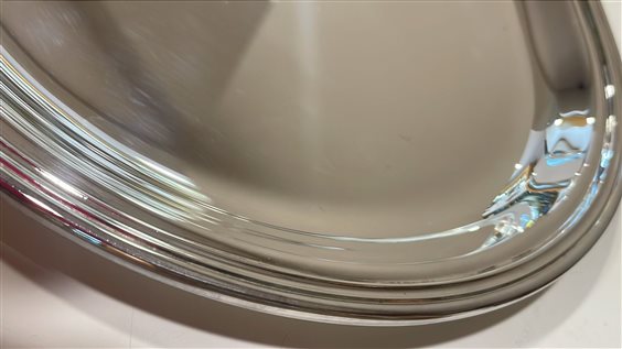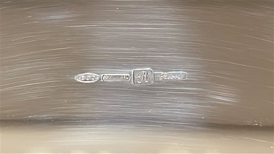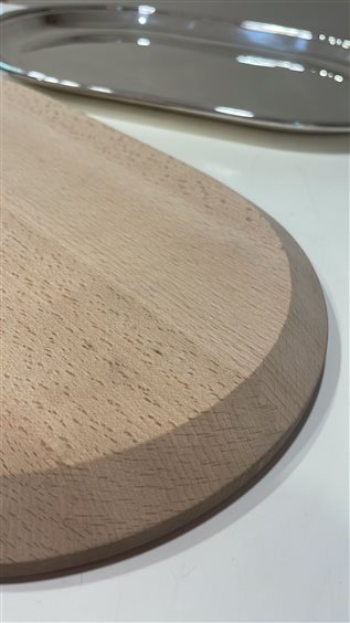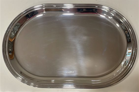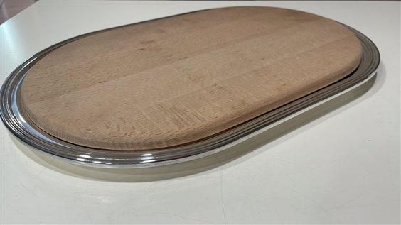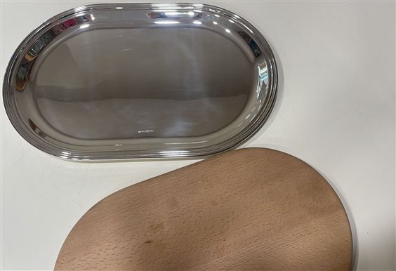 PREGIATO PEZZO D'ARGENTERIA. L'ALTA QUALITA' DEI MATERIALI E DELLA LAVORAZIONE SONO GARANTITI DAI MARCHI LEGALI IMPRESSI SUL PEZZO. TAGLIERE RICCI CON VASSOIO IN ARGENTO 800 DALLA FORMA OVALE IN STILE INGLESE A BASE LUCIDA E LISCIA, CON BORDO LAVORATO A MANO, E TAGLIERE DI LEGNO MASSICCIO OVALE.