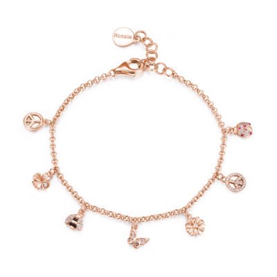 RZGA14 CON PENDENTI PRIMAVERA Bracciale in argento 925‰ e placcatura oro rosa con pendenti primavera a forma di simbolo della pace, quadrifoglio, ape, farfalla, fiore e coccinella, 65 cubic zirconia bianchi e 7 cubic zirconia rossi. Tipo di pietra: zirconi Finitura: placcatura oro rosa Peso: 4.10 g Dimensioni bracciale: 185 mm