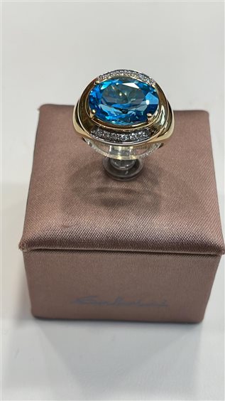 ANELLO SALVINI IN ORO GIALLO KT 18 CON TOPAZIO AZZURRO CENTRALE KT 1 E BRILLANTI KT 0.14 H. MISURA ANELLO 15. PESO 8.6 GR.