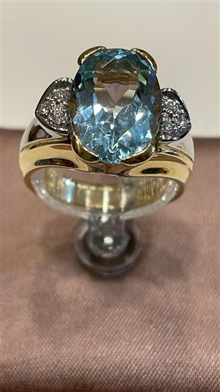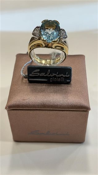 ANELLO SALVINI IN ORO GIALLO KT 18 CON ACQUAMARINA KT 1.15 CENTRALE E PAVè DI DIAMANTI TAGLIO BRILLANTE KT 0.09 H. MISURA ANELLO 18. PESO ANELLO 8.20.