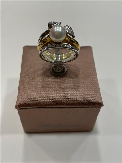 ANELLO SALVINI IN ORO BIANCO E GIALLO KT 18 CON PERLA BIANCA CENTRALE COLTIVATA IN ACQUA SALATA MM 7.5, CON BRILLANTI KT 0.12 H. MISURA ANELLO 15, PESO ANELLO 9.10 GR.