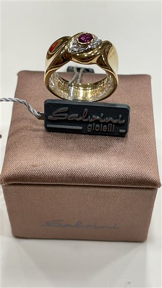 ANELLO SALVINI IN ORO GIALLO KT 18 CON RUBINO CENTRALE E PAVè DI DIAMANTI TAGLIO BRILLANTE KT 0.06 H. MISURA ANELLO 16.PESO ANELLO 7.60 GR.