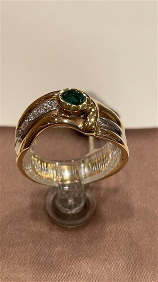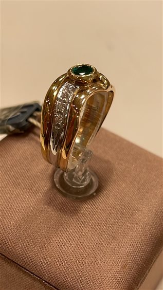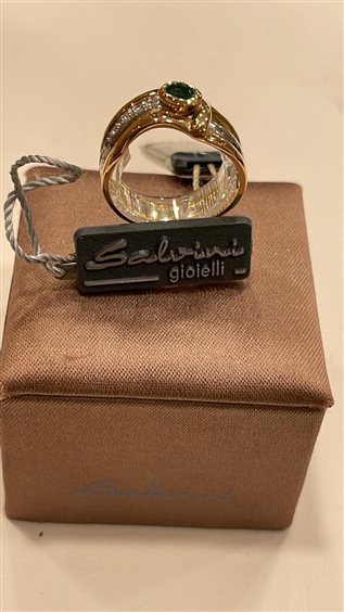 ANELLO SALVINI IN ORO GIALLO E BIANCO KT 18 CON SMERALDO KT 0.22 CON PAVè DI DIAMANTI TAGLIO BRILLANTE KT 0.05 H. MISURA ANELLO 15. PESO ANELLO 5.20.