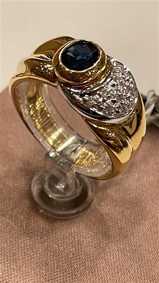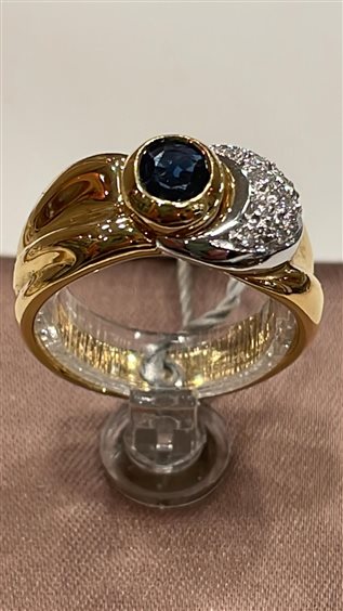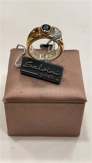 ANELLO SALVINI IN ORO GIALLO KT 18 CON ZAFFIRO KT 0.58 E PAVè IN DIAMANTI TAGLIO BRILLANTE KT 0.12 H. MISURA ANELLO 14. PESO ANELLO 7.40 GR.