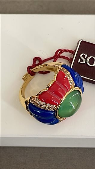 ANELLO SOVRANI DONNA IN OTTONE PLACCATO ORO GIALLO CON PIETRA SINTETICA VERDE CENTRALE E SMALTI BLU E ROSSO CON ZIRCONI BIANCHI, MISURA 14 REGOLABILE.