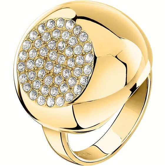 Prodotto: anello donna gioielli Trussardi T-Design Anello da donna del brand Trussardi della collezione T-Design. Anello di colore oro giallo con misura:14. Anello in acciaio e cristalli. Questo articolo verrà spedito con Scatola Originale Trussardi se prevista dal brand