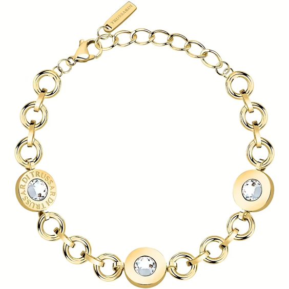 Prodotto: bracciale donna gioielli Trussardi T-Logo TJAXC111 Bracciale da donna del brand Trussardi della collezione T-Logo. Bracciale di colore oro giallo con misura: 16+3 cm. Bracciale in acciaio e cristalli. La referenza è: TJAXC111 Questo articolo verrà spedito con Scatola Originale Trussardi se prevista dal brand