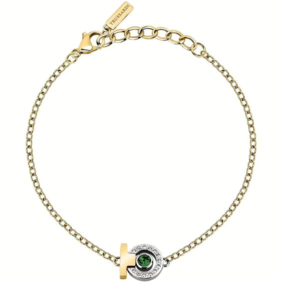 Prodotto: bracciale donna gioielli Trussardi T-Logo TJAXC58 Bracciale da donna del brand Trussardi, della collezione T-Logo. Materiale Acciaio, Cristalli, colore metallo Acciaio/Oro, misure 16|3CM. La referenza è: TJAXC58. Questo bracciale verrà spedito con Scatola Originale Trussardi