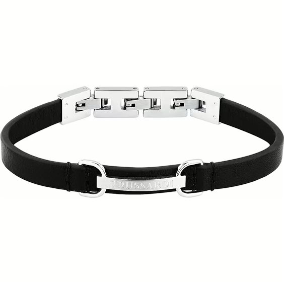 Prodotto: bracciale uomo gioielli Trussardi T-Leather TJAXZ08 Bracciale da uomo di Trussardi della collezione T-Leather. Bracciale in acciaio di colore argento e pelle nera. Misura: 18 + 3cm. La referenza è TJAXZ08 Questo articolo verrà spedito con Scatola Originale Trussardi