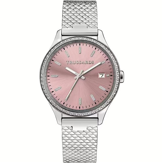 Prodotto: orologio solo tempo donna Trussardi City Life - R2453170506 R2453170506 Orologio da donna del brand Trussardi, della collezione City Life. Forma tonda , materiale Acciaio, funzioni Tempo, Data, colore cinturino Acciaio, dimensione cassa 35mm. Resistenza all'acqua 5 ATM, Vetro minerale. La referenza è: R2453170506. Questo solo tempo verrà spedito con Scatola Originale Trussardi