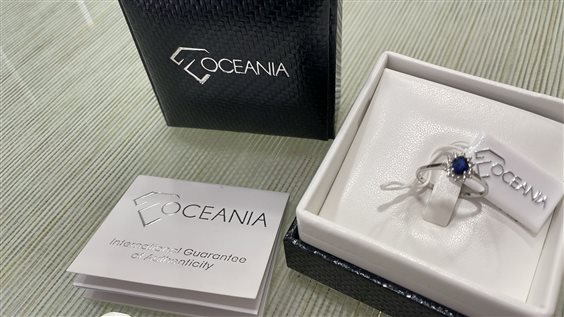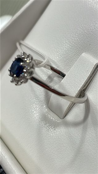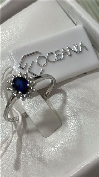 ANELLO OCEANIA IN ORO BIANCO KT 18 CON ZAFFIRO KT 0.40 DIMENSIONE 5X4mm E DIAMANTI TAGLIO BRILLANTE KT 0.09 GVS. IL GIOIELLO VERRA' SPEDITO CON SCATOLA ORIGINALE E CERTIFICATO DI GARANZIA INTERNZAIONALE.