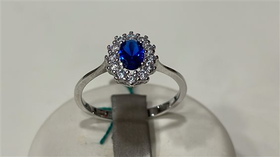 anello in oro bianco 18kt modello a cestino con zirconi bianchi e pietra zircone centrale blu