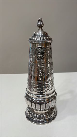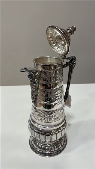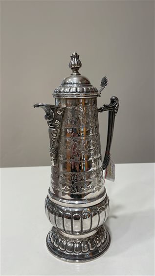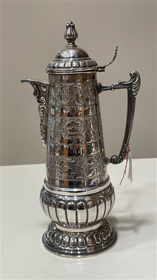 PREGIATO PEZZO D'ARGENTERIA. L'ALTA QUALITA' DEI MATERIALI E DELLA LAVORAZIONE SONO GARANTITI DAI MARCHI LEGALI IMPRESSI SUL PEZZO. CIOCCOLATIERA FINEMENTE CESELLATA IN ARGENTO MASSICCIO 800, CON MOTIVI FLOREALI E FOGLIACEI, GR 606.