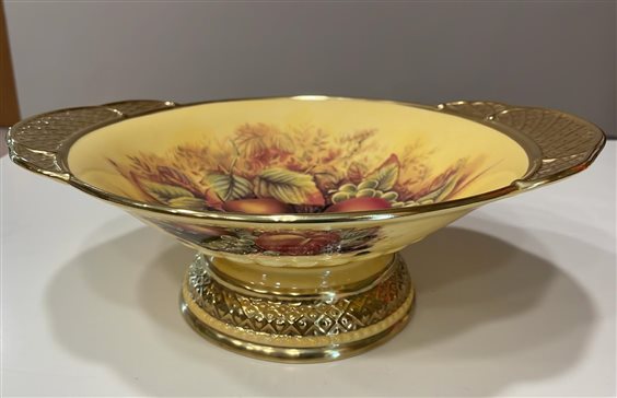 CENTROTAVOLA AYNSLEY IN PORCELLANA, PEZZO EDIZIONE LIMITATA 73/249. Aynsley China fu fondata nel 1775 da John Aynsley. L'azienda è un fornitore privilegiato della famiglia reale britannica. Questa è una delle collezione più amate e riconosciute di Aynsley: fondo giallo, Natura morta-Centro frutta autunnale. Realizzato in Inghilterra La porcellana ossea è un tipo di porcellana a pasta morbida composta da cenere ossea, materiale feldspatico e caolino.