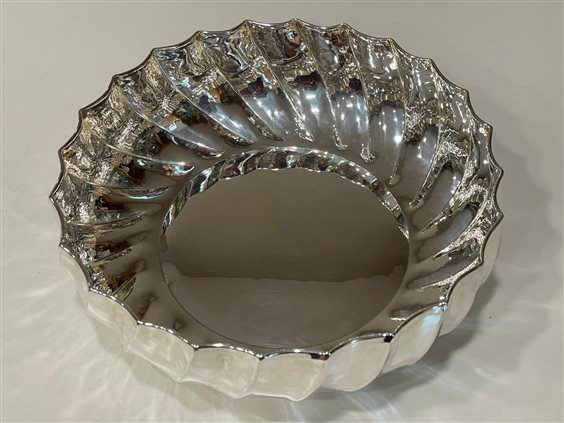 PREGIATO PEZZO D'ARGENTERIA DELL'ARIGIANATO FIORENTINO. L'ALTA QUALITA' DEI MATERIALI E DELLA LAVORAZIONE SONO GARANTITI DAI MARCHI LEGALI IMPRESSI SUL PEZZO. CIOTOLA TONDA IN ARGENTO MASSICCIO 800, GR 534. BASE LISCIA CON BORDO ONDULATO.