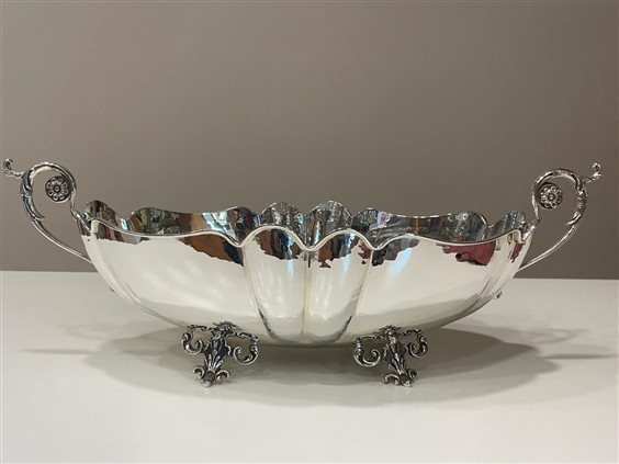 PREGIATO PEZZO D'ARGENTERIA DELL'ARTIGIANATO PALERMITANO. L'ALTA QUALITA' DEI MATERIALI E DELLA LAVORAZIONE SONO GARANTITI DAI MARCHI LEGALI IMPRESSI SUL PEZZO. JATTA OVALE DI STANCAMPIANO IN ARGENTO MASSICCIO 800, CON LAVORAZIONE IN MICROFUSIONE SU MANICI E PIEDI. BASE JATTA MARTELLATA CON BORDO LISCIO A ONDE.