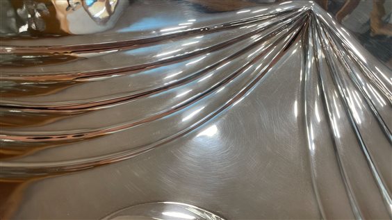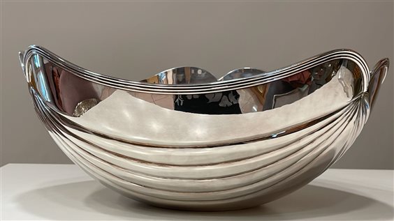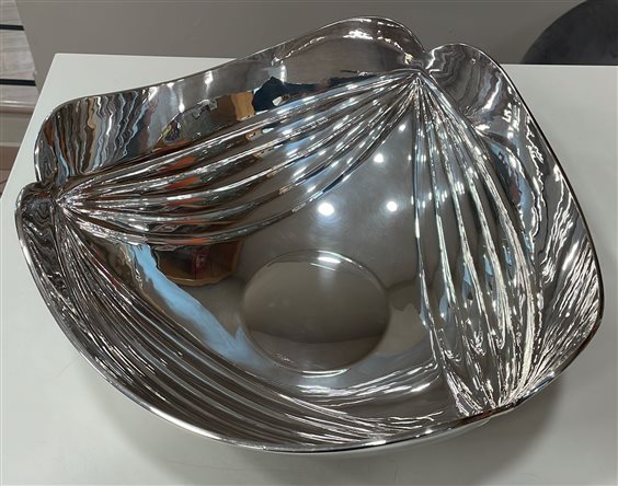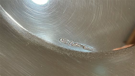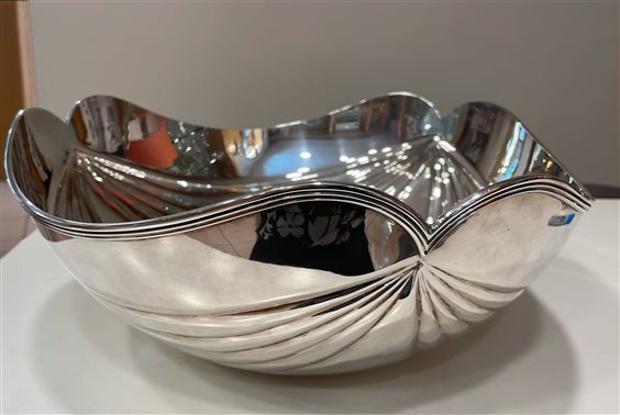 PREGIATO PEZZO D'ARGENTERIA. L'ALTA QUALITA' DEI MATERIALI E DELLA LAVORAZIONE SONO GARANTITI DAI MARCHI LEGALI IMPRESSI SUL PEZZO. CITOLA IN ARGENTO MASSICCIO 800, GR 1223. BORDO A ONDE E SUPERFICIE CON RIGHE ASIMMETRICHE.