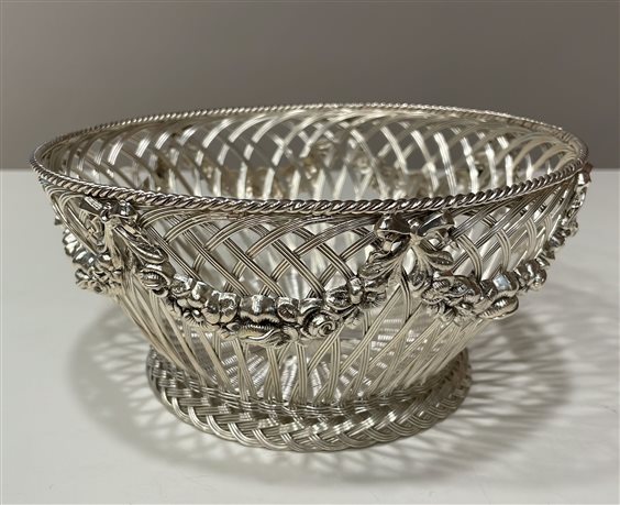 PREGIATO PEZZO D'ARGENTERIA. L'ALTA QUALITA' DEI MATERIALI E DELLA LAVORAZIONE SONO GARANTITI DAI MARCHI LEGALI IMPRESSI SUL PEZZO. CESTINO TRAFORATO MARCHIO TOPAZIO DEL 1974 MADE IN PORTOGALLO, IN ARGENTO CON MOTIVI FLOREALI E BORDO ATTORCIGLIATO, GR 517.